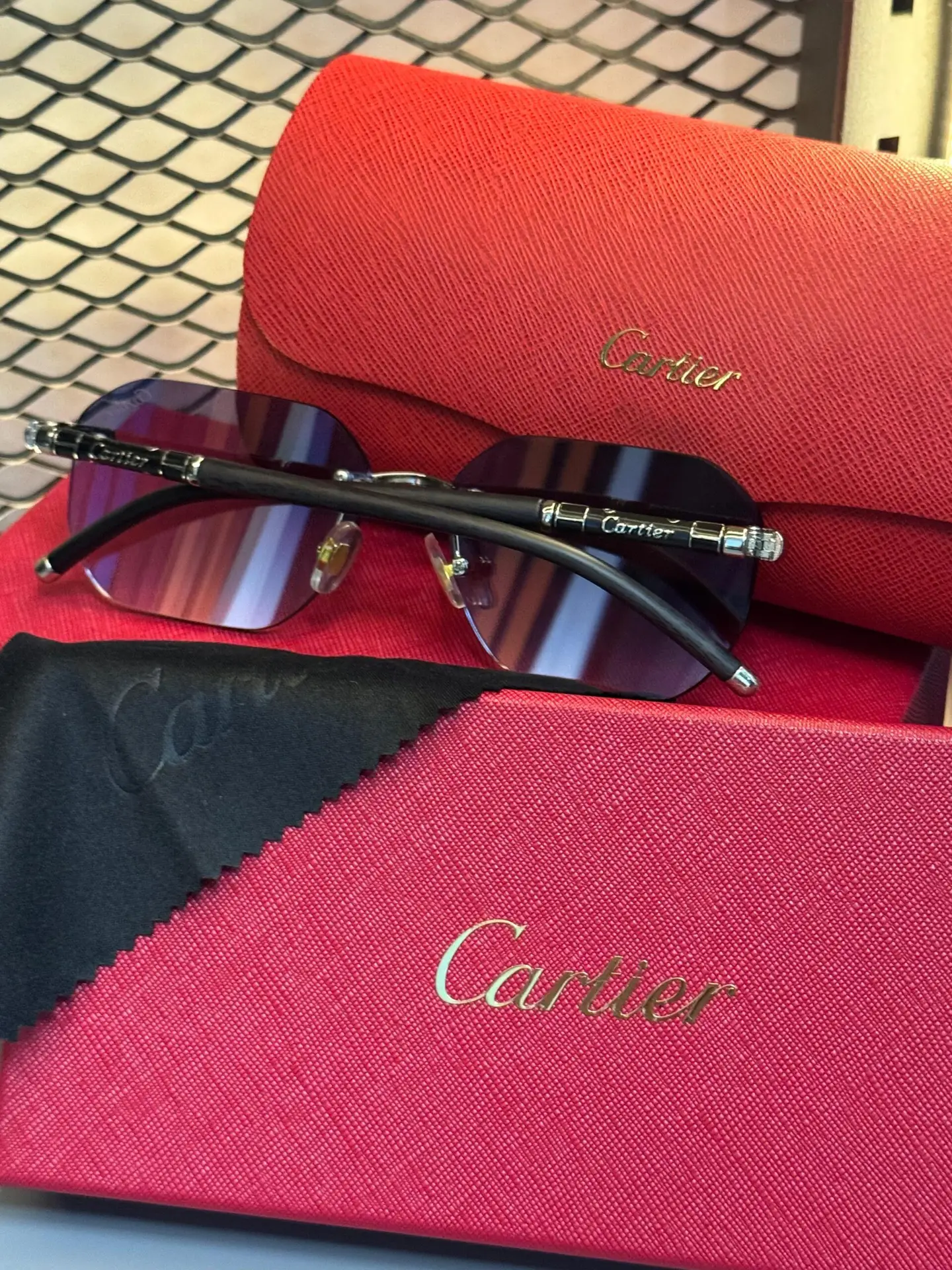 Design sem aro com lentes geométricas em tom cinza com reflexo azulado, fixadas por parafusos decorativos prateados. A ponte C Décor ondulada em metal platinum traz o logo Cartier gravado. As hastes em metal preto com detalhes prateados completam a estética monocromática. É o Cartier C Décor para o cliente stealth: mesmo status, mesmo DNA de alta joalheria, zero brilho dourado. Estética arquitetônica, futurista e extremamente versátil.