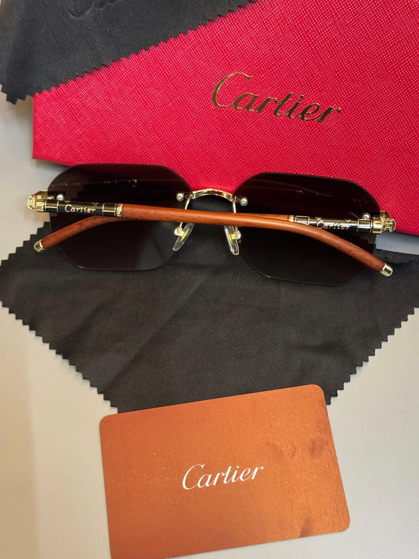 Design sem aro com lentes marrom escuro fixadas por parafusos decorativos dourados. A ponte e os detalhes metálicos são banhados a ouro, com o logo Cartier gravado na ponte e nas hastes. As hastes em madeira Bubinga, mesma usada nos interiores de carros de luxo, trazem veios naturais únicos em cada peça. É o Cartier mais exclusivo da linha: material nobre, acabamento joalheiro e status instantâneo. Modelo icônico usado por artistas e colecionadores do mundo todo.