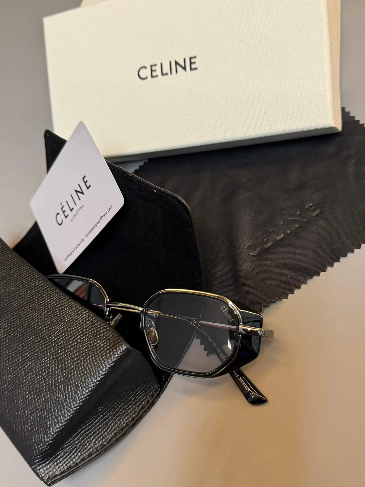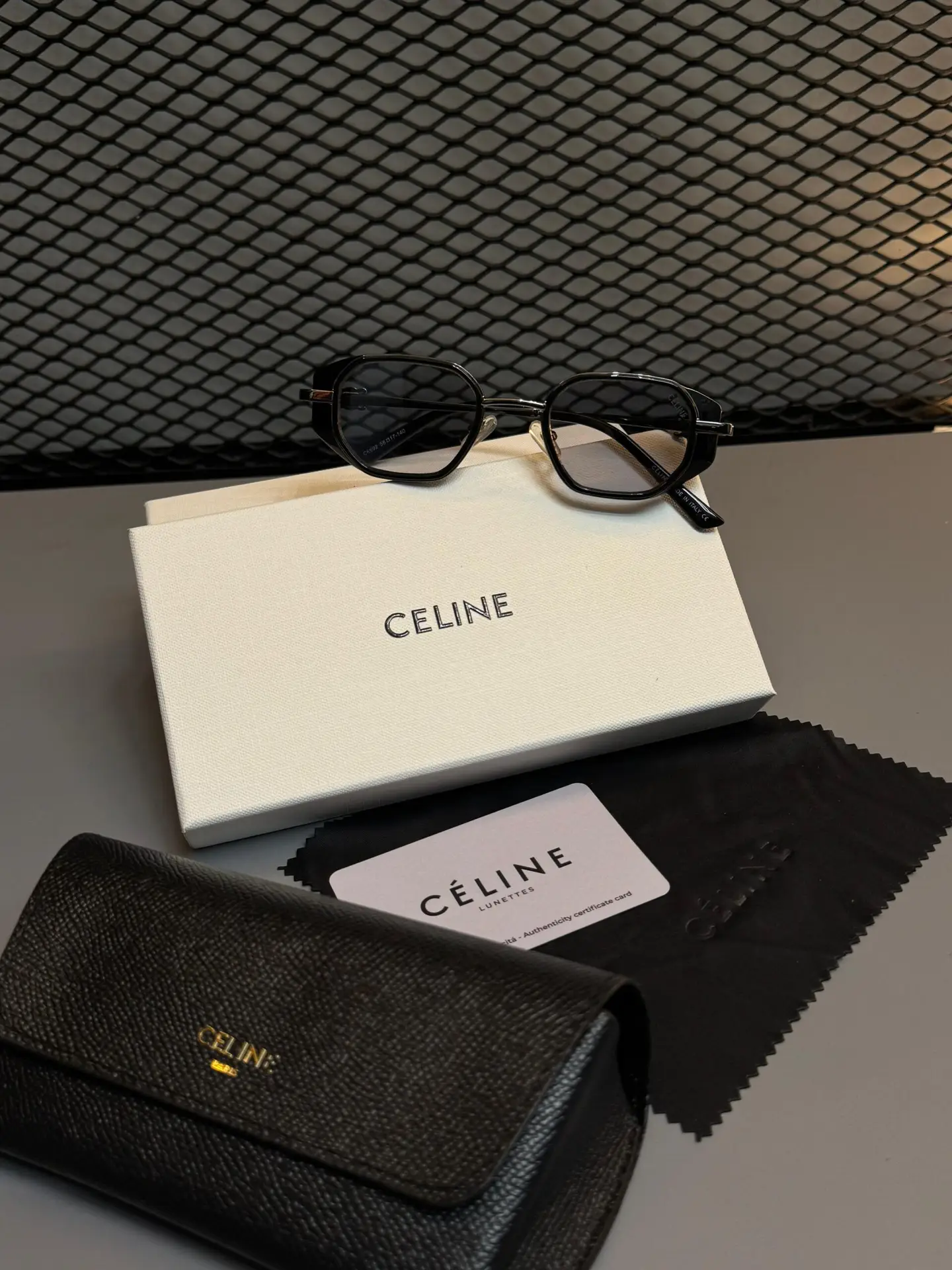 Óculos de grau Celine armação hexagonal em acetato e metal preto. Design geométrico com luxo parisiense discreto.