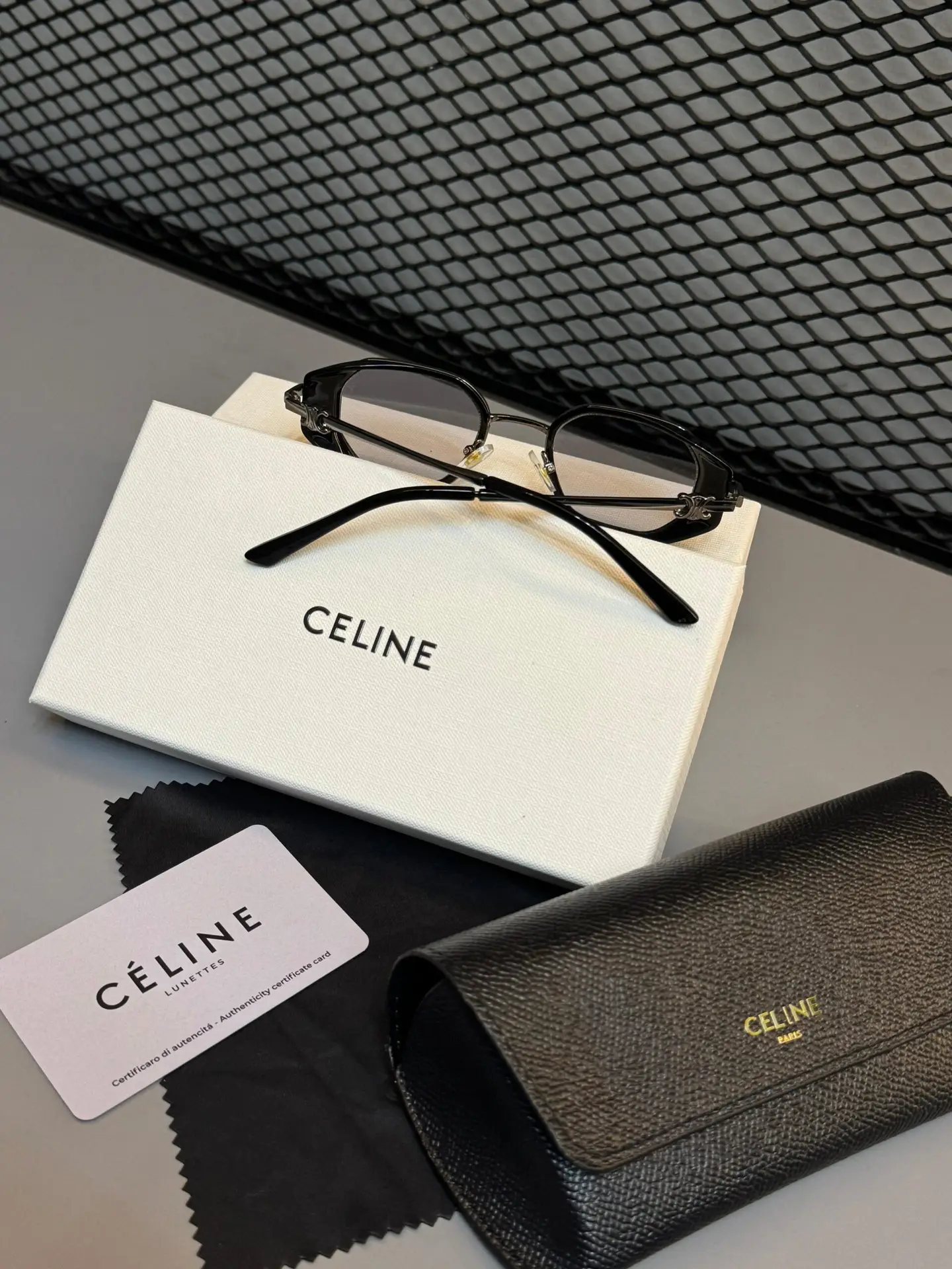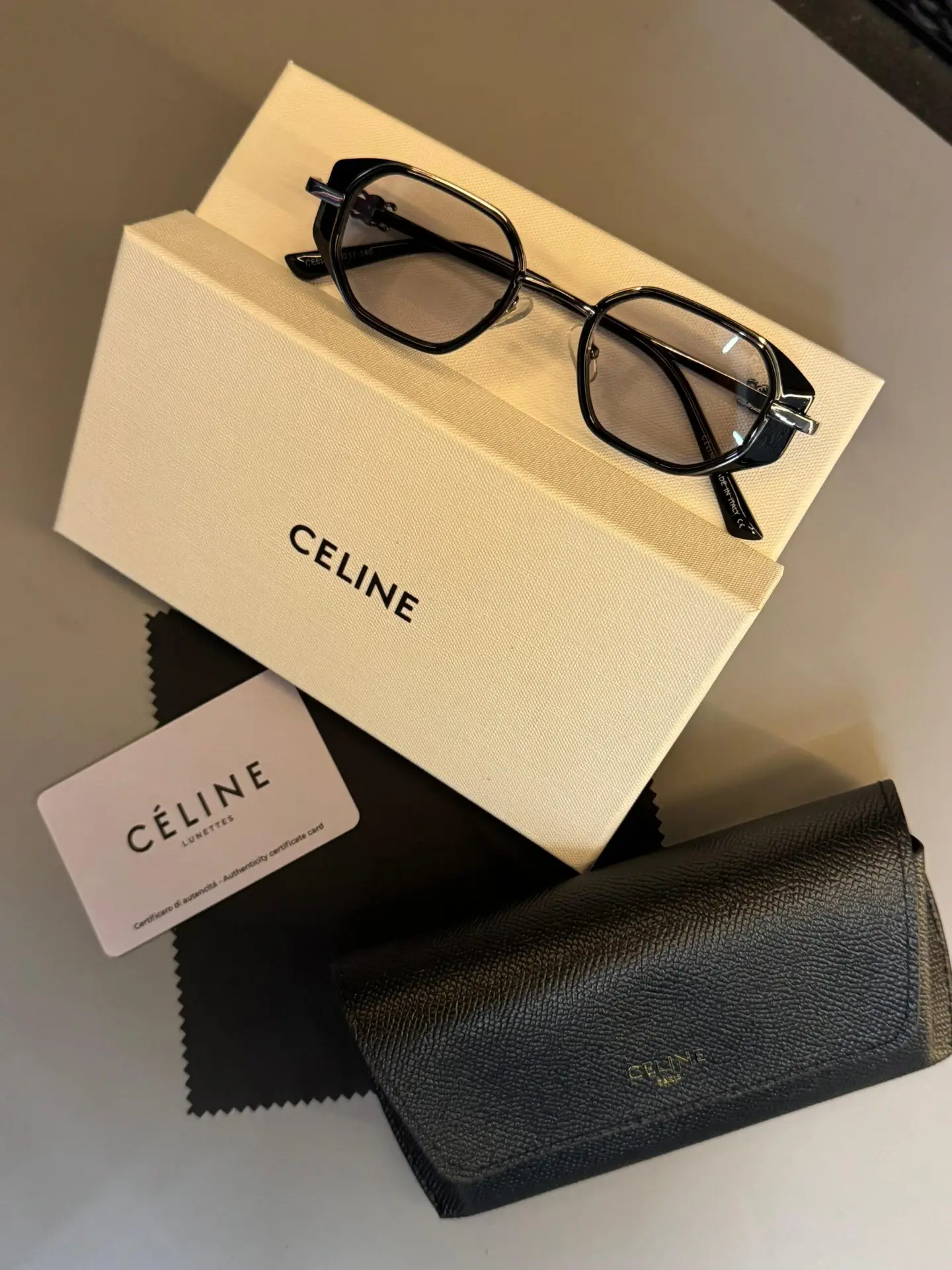 Acompanha kit completo original Celine: case rígido em couro texturizado preto com logo dourado, flanela de limpeza preta, cartão de autenticidade CÉLINE LUNETTES e caixa off-white. Peça unissex que funciona como óculos de grau ou solar com troca de lentes.